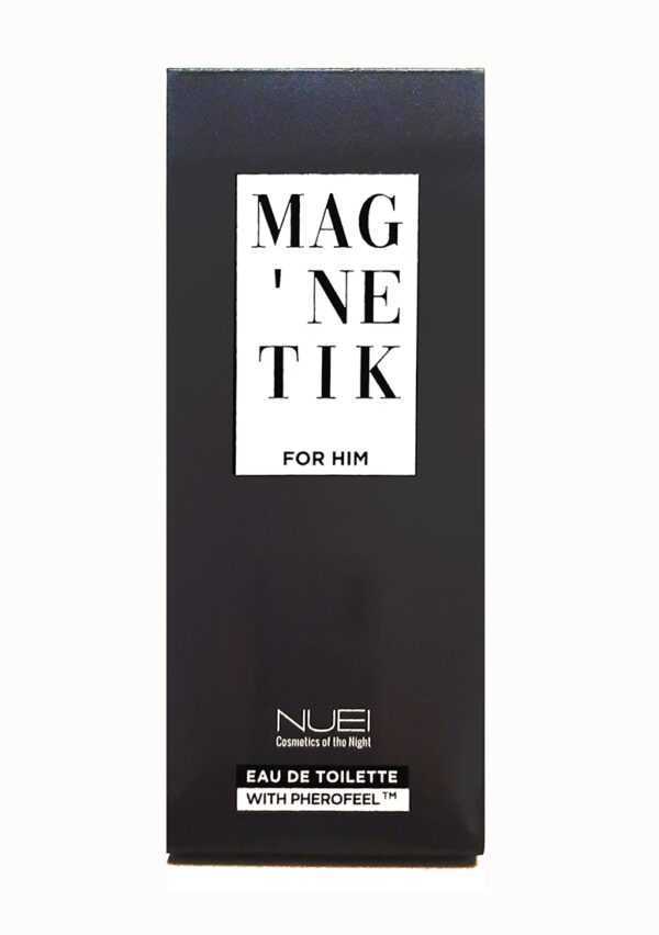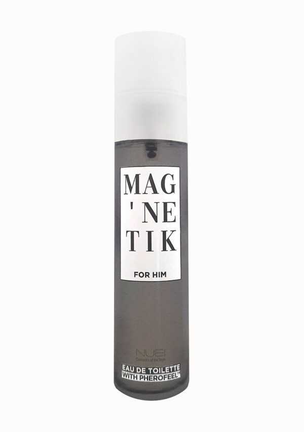 Mag’netik is een nieuwe productlijn op basis van een actief ingredient van NUEI genaamd PherofeelTM. Dit product speelt in op de marktvraag naar nieuwe producten met feromonen om de fysieke aantrekkingskracht en het verlangen te versterken. PHEROFEELTM for him en PHEROFEELTM for her zijn gemaakt van kruideningredienten en ayurvedische geneeskrachtige planten en zijn een combinatie van actieve ingredienten die zijn ontworpen met als doel het gevoel van aantrekkingskracht en seksueel verlangen. Ze werken als een versterker bij de productie van het mannelijke feromonen androstadienone en om vrouwelijke feromonen van het copuline-type na te bootsen.PHEROFEELTM is een geregistreerd handelsmerk van NUEI Cosmetics of the Night, bewezen effectief en dat u niet in andere producten zult vinden.MAG NETIK voor hem is een herenparfum met PHEROFEELTM. Een geur met een vleugje houtachtig met kruiden die frisse aroma’s van citrusvruchten zoals mandarijn en bergamot combineert met een achtergrond van patchouli, vetiver en mos. Een fris parfum ontworpen voor verleiding. Dankzij de concentratie in PHEROFEELTM, wil MAG’NETIK de aantrekkelijkheid van mannen accentueren door de synthese van de mannelijke feromonen zelf te verbeteren. MAG?NETIK voor hem is de enige mannenparfum op de markt die PHEROFEELTM voor hem bevat, exclusief voor NUEI. Het is langdurig dankzij de concentratie van plantaardige ingredienten in combinatie met PHERFEELTM die de duur van de eau de cologne op de huid verlengen. Breng twee of drie verstuivingen op de huid aan.