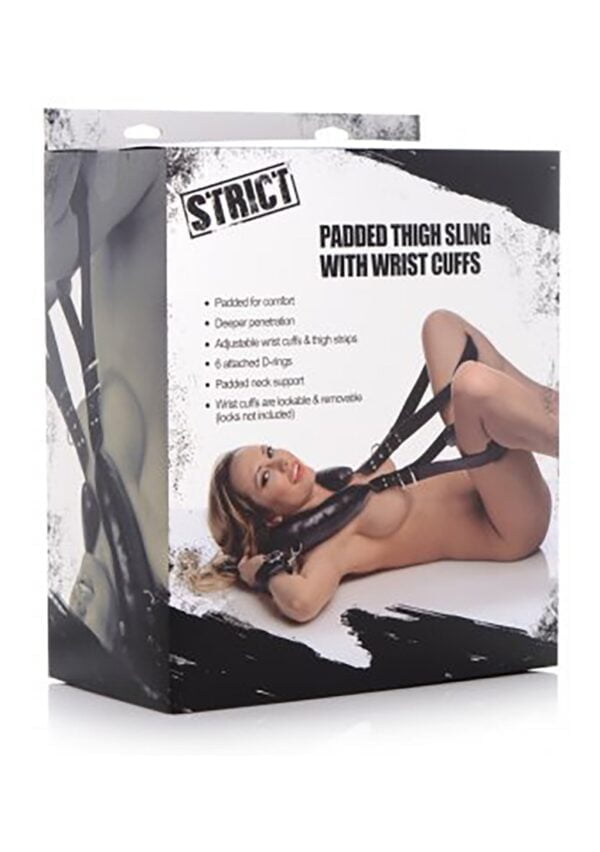 Elke manchet is verwijderbaar als u uw eigen manchetten wilt gebruiken. Perfect voor experts en amateurs om te bondage spelen, vast te houden en te spelen zonder ongemak met deze Padded Sling! Afmetingen: Dij manchetten zijn verstelbaar van 20 inch tot 28 inch omtrek. Pols manchetten zijn verstelbaar van 6,25 inch tot 10 inch omtrek. Bandbreedte 1,5 inch. Gevoerde nekondersteuning past op de meeste nekken. Materialen: PU-leer en metaal, ftalaat- en nikkelvrij. Kleur: Zwart