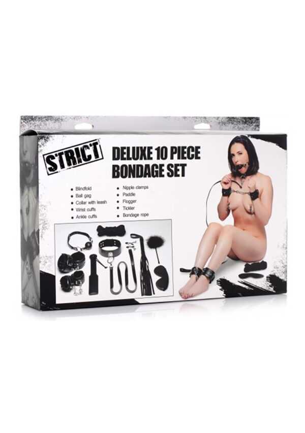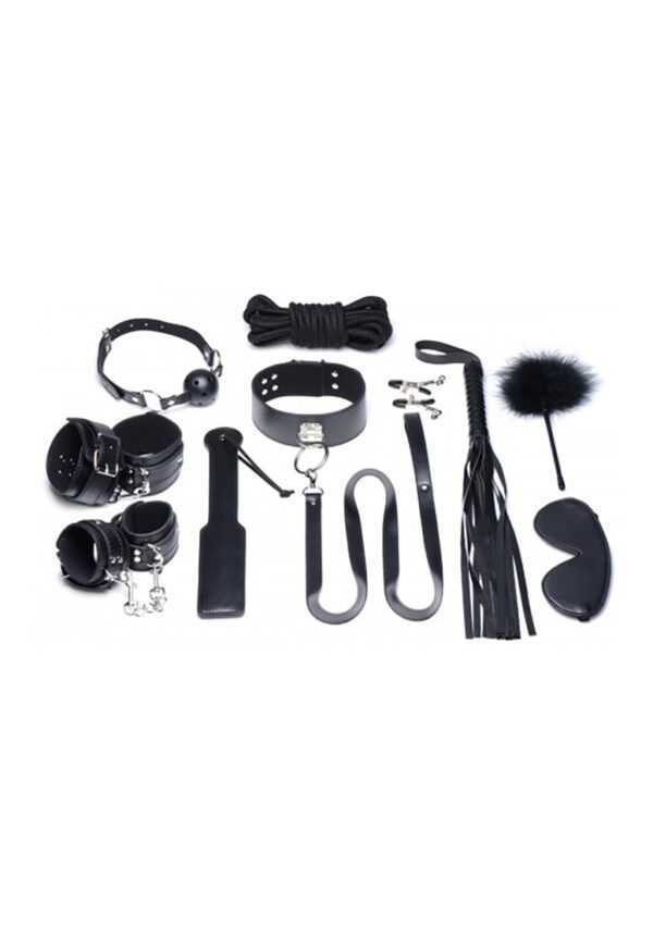 10 Bondage Essentials voor iedereen die de donkere kant van zijn slaapkamer wil verkennen! Alles wat je nodig hebt om je partner vast te binden, te kokhalzen en te straffen, is inbegrepen in deze Deluxe 10-delige Bondage Set: een dikke blinddoek, ademende balgag, brede halsband met riem, een set pols- en enkelboeien, een paar tepelklemmen , een veelzijdige bundel touw, een handige kleine peddel, een verleidelijke tickler en een bevredigende flogger. Bind je geliefde vast met de meegeleverde manchetten, kraag en touw om ze op hun plaats te houden voor jouw plezier. Experimenteer met traditionele BDSM-activiteiten zoals sensorische deprivatie, pijnspel, straf, onderwerping en plagen! Verbreed je seksuele horizon en ontdek welke elementen van BDSM bij jou en de speelstijl van je partner passen. Elk item is gemaakt van duurzame materialen voor langdurig verblijf in je slaapkamer – gebruik ze samen of met je favoriete speelgoed. Met beginnersvriendelijke items zoals verstelbare manchetten en blinddoeken voor degenen die langzaam willen beginnen, evenals deskundige nietjes zoals de ademende gag, touw en tepelklemmen, zodat je je langzaam aan de meer extreme kant van BDSM kunt wagen!