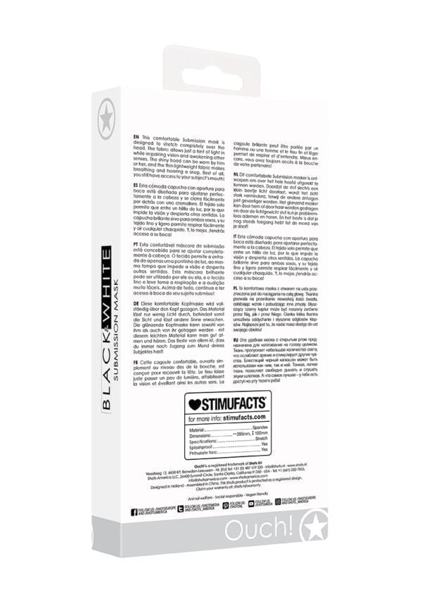 Doordat de stof slechts een klein beetje licht door- laat, wordt het zicht sterk verminderd, terwijl de an- dere zintuigen juist gevoeliger worden. Het glanzend masker kan door hem of door haar worden gedra- gen en door de lichtgewicht stof kun je probleemloos ademen en horen. En het beste is dat je nog steeds toegang hebt tot de mond van je slaaf!