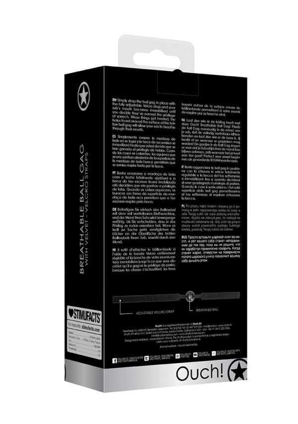 Neem de controle met de Ouch! ademende Ball Gag. Maak de ball gag eenvoudig vast met de volledig verstelbare klittenbandsluiting en de mond van je sub wordt ge?mmobiliseerd totdat je besluit dat ze het voorrecht van spreken hebben verdiend. Wanneer de gemoederen verhit raken, zorgen de gaten rond het oppervlak van de holle ball gag ervoor dat je sub door zijn mond en neus kan ademen. Perfect voor beginners of voor intense sc?nes die je Sub buiten adem kunnen laten, deze ball gag is een must voor elke goed uitgeruste gear bag of dungeon wall.