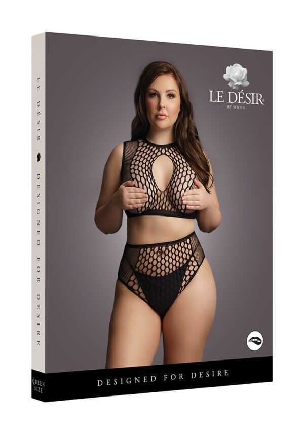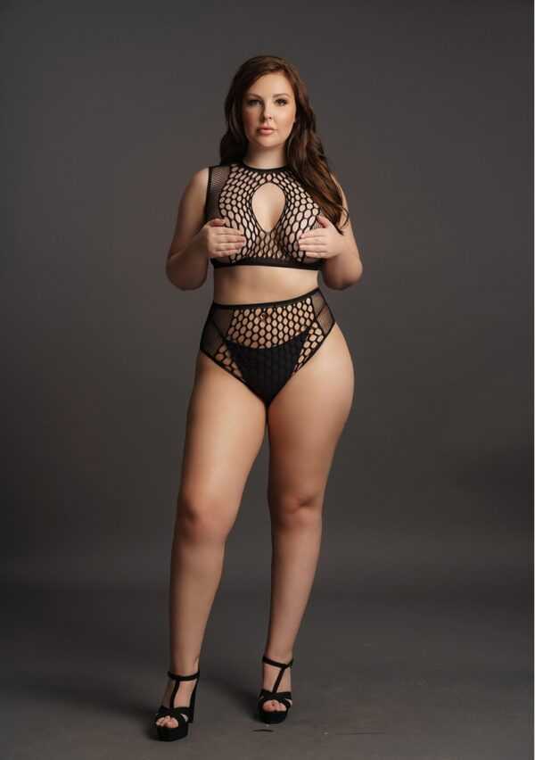 Tweedelige set met crop top en slip met hoge taille, een combinatie van visnet en fence net met opengewerkte details voorzijde. De zachte, superelastische stof is geschikt voor maten XL tot 4XL.String niet inbegrepen.