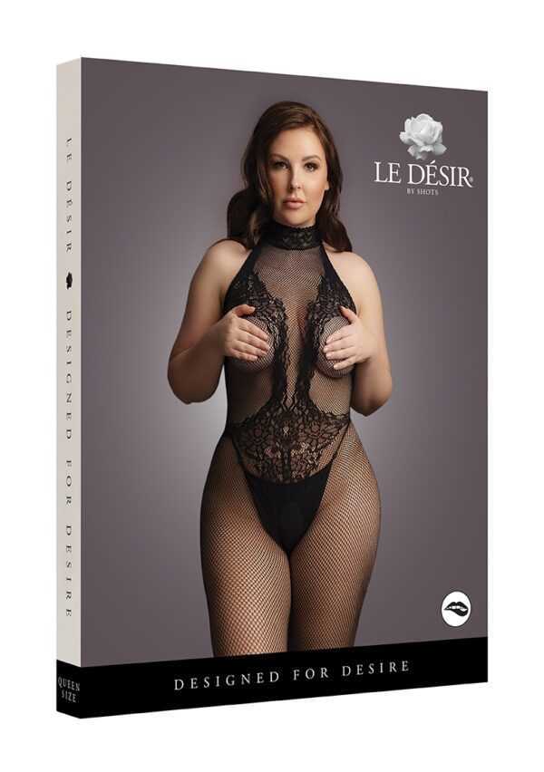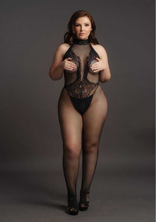 Bodystocking met combinatie van kantpatroon en visnet, halternek en open kruis. De zachte, superelastische stof is geschikt voor maten XL tot 4XL.String niet inbegrepen.