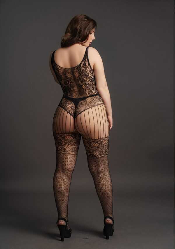 Bodystocking met kantpatroon, met effect van een body en sexy faux visnet kousen. De zachte, superelastische stof is geschikt voor maten XL tot 4XL.String niet inbegrepen.
