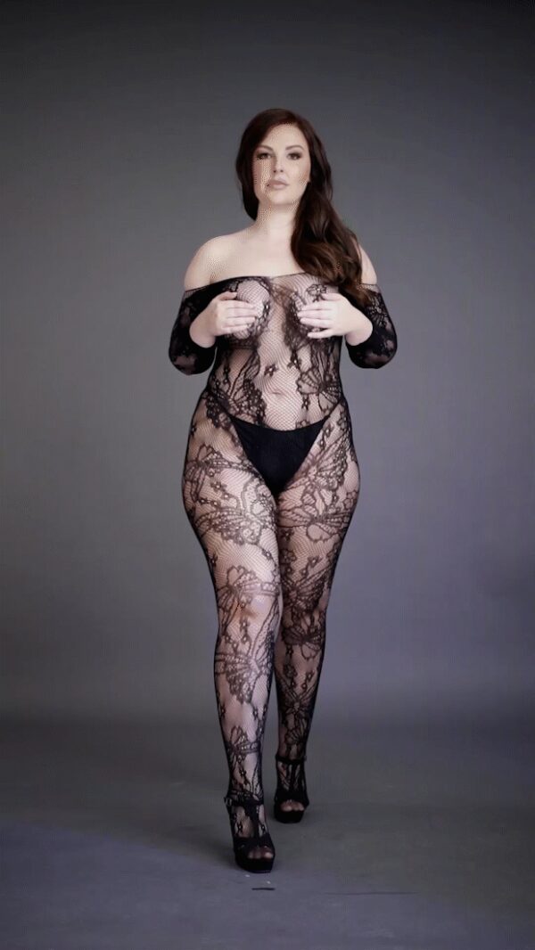 Bodystocking van kantpatroon met lange mouwen en open kruis. Kan op of van de schouders worden gedragen. De zachte, superelastische stof is geschikt voor maten XL tot 4XL.String niet inbegrepen.