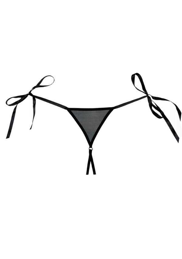 Plagerige dunne linten versieren de heupen, wachtend om losgemaakt te worden. Geschulpte kant omlijnt een provocerende ouverte voorkant, terwijl de Braziliaanse achterkant is bedekt met een driehoek van doorschijnend gaas.