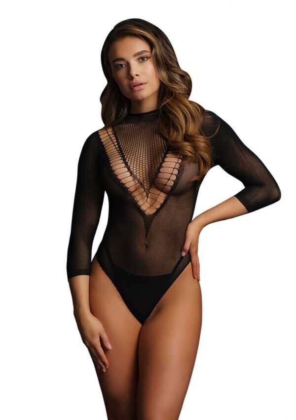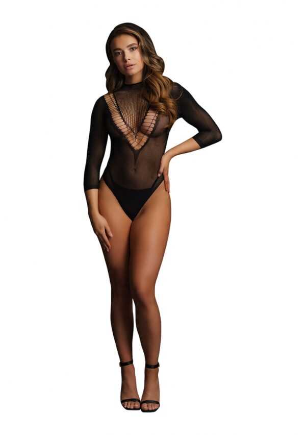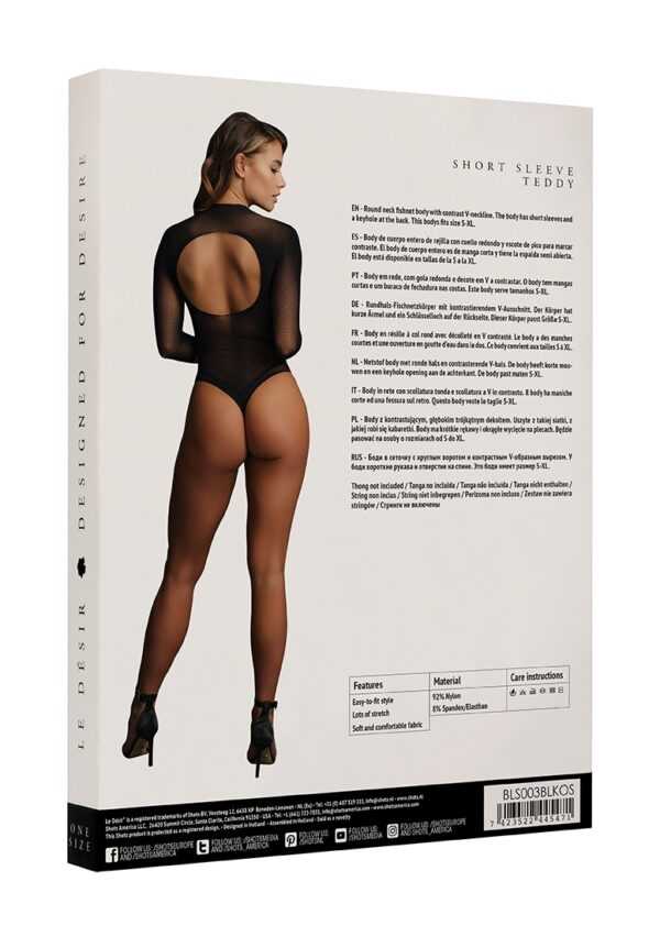 Netstof body met ronde hals en contrasterende V-hals. De body heeft korte mouwen en een keyhole opening aan de achterkant. De body past maten S-XL. String niet inbegrepen.String niet inbegrepen.