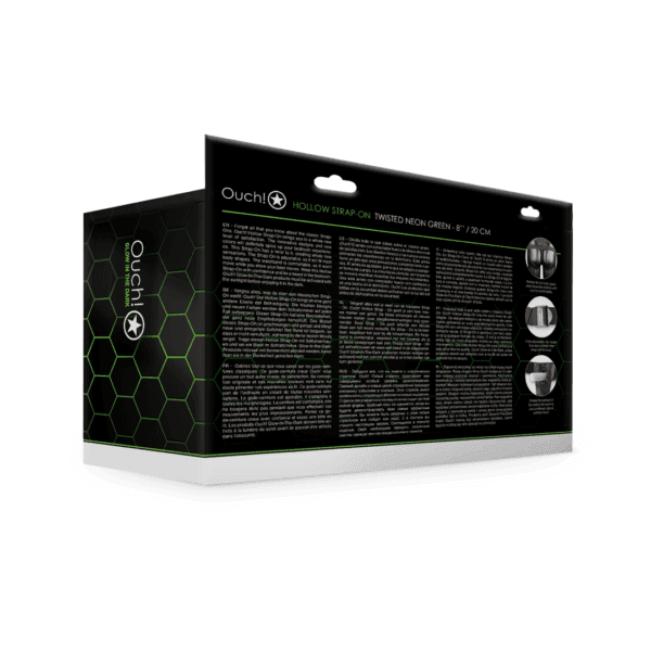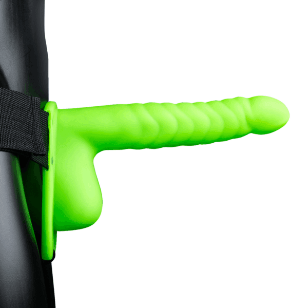 Ouch! – Glow in the Dark Ribbed Hollow Strap-On met Ballen – 8 / 21 cm – Neon Groen