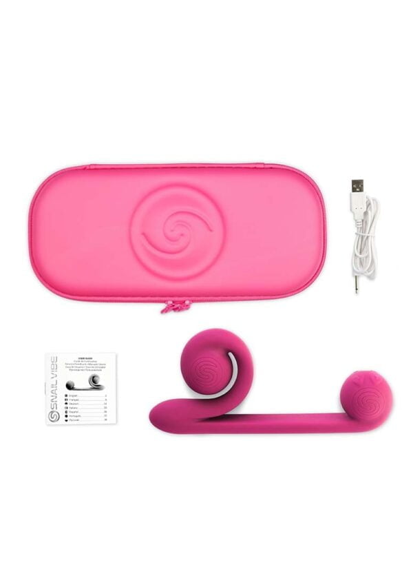De vibrerende kracht van een massagestick, de inbrengdiepte van een dildo en de dubbele stimulatie van een rabbit vibrator. De Snail Vibe is een veelzijdig seksspeeltje dat je alleen of met een partner kunt gebruiken. Voor een klassieke vibratorervaring houd je de flexibele clitorisstimulator vast of pas je de intense vibraties extern toe op de clitoris of een ander lichaamsdeel waar massage gewenst is. De multifunctionele vibrator heeft 2 krachtige onafhankelijke motoren, 1 voor clitorisstimulatie in de spiraalkop en 1 voor innerlijk genot aan de punt van de schacht. In tegenstelling tot traditionele rabbit vibrators zorgt het revolutionaire gepatenteerde spiraalkopontwerp van de Snail Vibe ervoor dat de clitorisstimulator een continue verbinding behoudt tijdens het gebruik. INBEGREPEN IN DE DOOS – Snail Vibe, beschermhoes, oplaadkabel, handleiding.