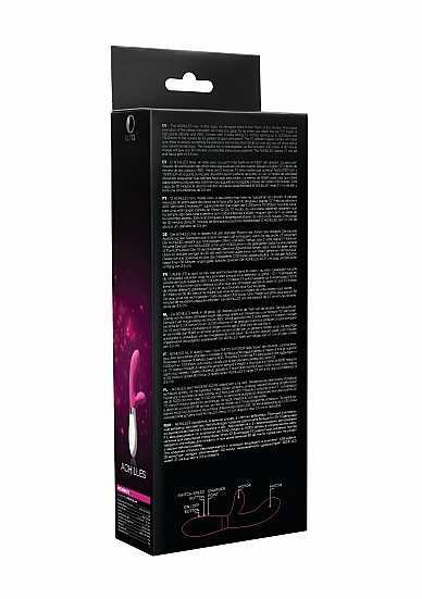 De ACHILLES heeft, in dit geval, zijn sterkste punt in de hiel van de vibrator. De robuuste uitvoeringvan de clitoris stimulator maakt dat u naar adem zult snakken als u uw hoogste O laat horen.Gemaakt van hoogwaardig silicone en ABS. Wordt geleverd met 2 extra sterke F1 motoren met eentoerental tot 5.200 omwmin en 15.000 omwmin in de gebogen punt voor perfecte G-spot stimulatie!De 10 verschillende snelheidsmodi zorgen ervoor dat er altijd voor elk wat wils isen bij minder dan 60dB is niemand anders op de hoogte van uw geheime rendez-vous. Dit prachtigespeelgoed is oplaadbaar via de meegeleverde USB-kabel. 30 minuten opladen geeft u 60 minutenongebreideld verzadigend speelplezier! De ACHILLES heeft een lengte van 21 cm en een diametervan 3,5 cm.