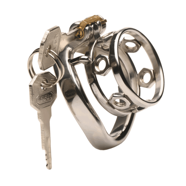 Lock Down – Kinkkooi – Zwart – Explore new realms of submission and control with the Lock Down Chastity Cage. The cum-thru tip lets you maintain bathroom convenience, even during extended wear. Thanks to the breathable design, evenly spaced holes ensure your comfort by keeping everything ventilated. Customize your experience with four ring sizes, designed to give you the perfect fit around the base of your shaft. Enjoy secure confinement with two locking mechanisms: a pin and a key that only the Keyholder can operate. This comprehensive kit also includes an internal lock, 2 keys for additional peace of mind, a locking pin, and 5 keyholder tags that ensure that the Keyholder can tell if their naughty caged submissive breaks their chastity. Discover a new level of intimate play today! The cage slips onto a lubed, flaccid shaft. The pin is placed into the ring, the key locking it all in place. The Keyholder hangs the key around their neck. As you gaze up at them, you see the glint of the metal shining in the dim light, reminding you of their dominance over you. Suddenly, all you can think about is getting out of the cage, but you’ll do anything for them to get that privilege. They become your sole focus, pleasing them and making them think you are worthy of release. Measurements: Cage is approximately 3 inches Length x 2 inches Width. Ring inner diameters: 1.9 inches, 2.1 inches, 2.2 inches, 2.3 inches.